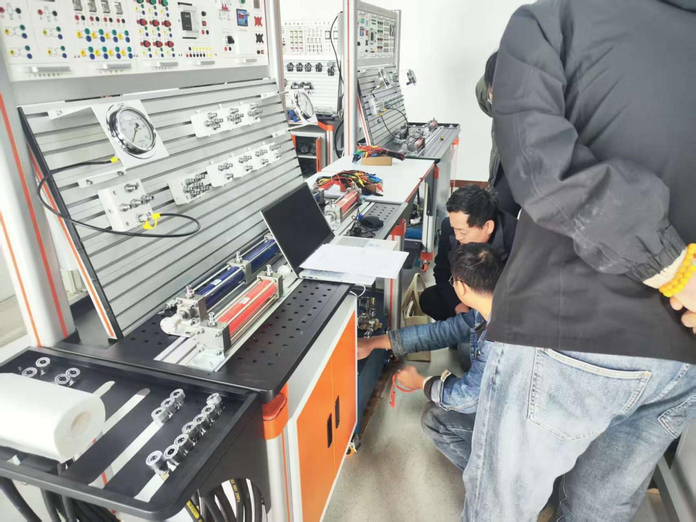 培训工作由厂商技术专家周工全程指导。为快速提升教师实操能力,培训伊始便选取复杂实训项目为示范,完整覆盖软件仿真建模、实地接线组装到系统调试演示等全环节,直观展现了液压传动系统的构建逻辑与运行原理。为强化培训效果,曲世永主任提出针对性方案,安排四位承担液压课程的教师各选实验项目独立操作,其余教师协同配合。现场氛围热烈高涨,王春华教授率先完成双作用油缸的调试安装,其余教师也相继顺利完成各自负责的液压回路搭建任务,团队协作攻克技术难点,推动培训工作迎来高潮。